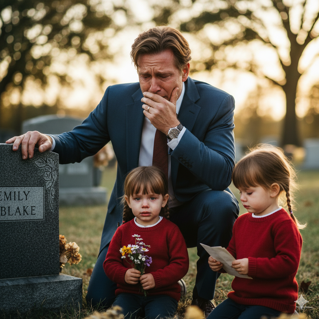 But it wasn’t the name on the grave that stopped him in his tracks. It was the two small figures kneeling beside it. He saw them from a distance at first, two little girls, maybe five years old, with matching brown hair pulled into low pigtails and wearing red sweaters that looked far too warm for the summer air.