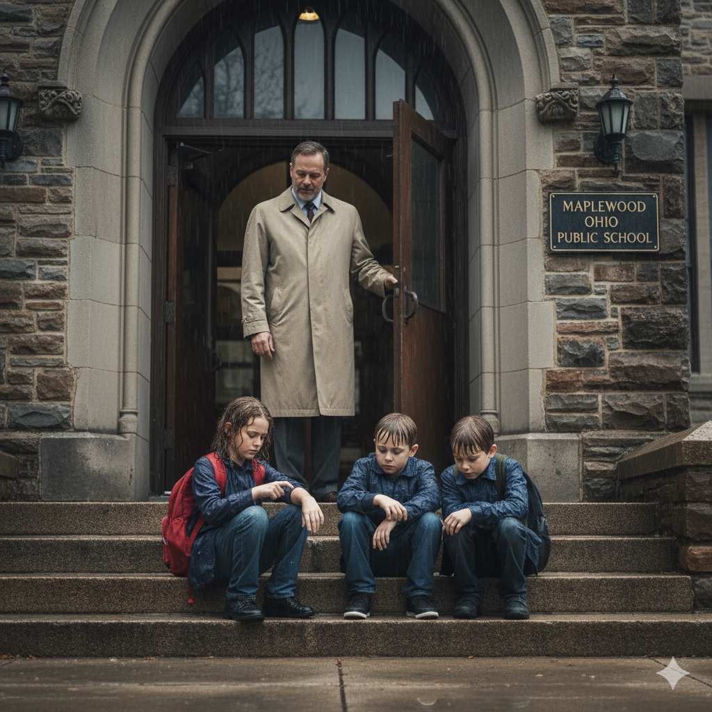 The rain came down like it always did in late November — slow, heavy, and without mercy. In the small town of Maplewood, Ohio, where the streets curled like sleepy rivers and porch lights burned all night, Thomas Avery sat alone in his classroom, watching the water streak down the windowpane.